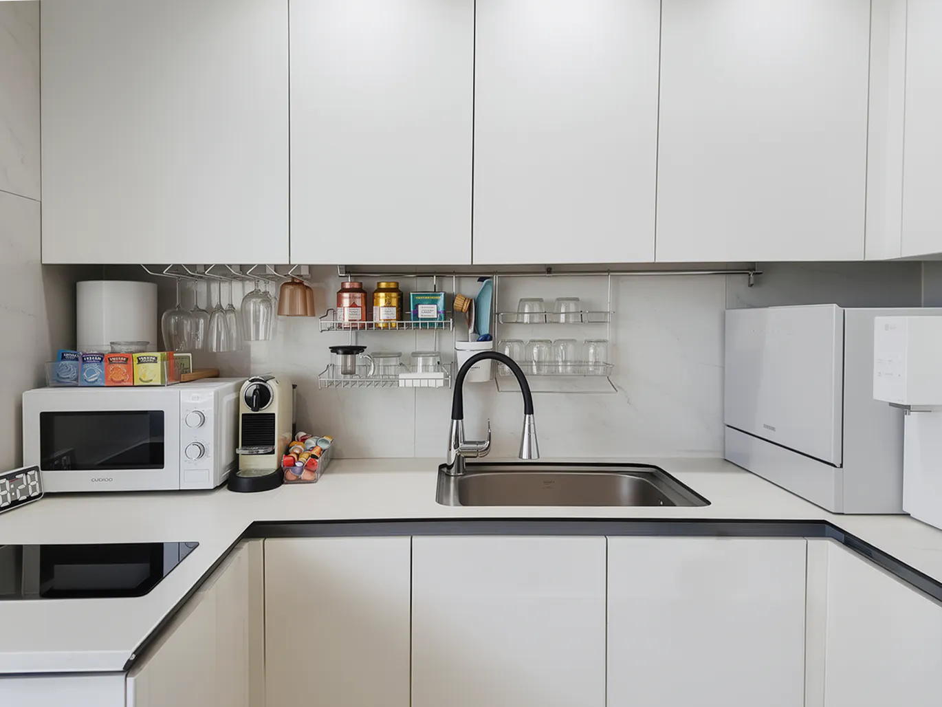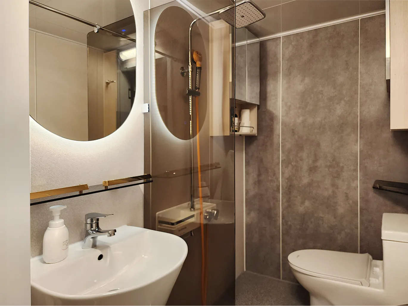 One queen bed, one single bed, a sleek living area, modern kitchen, and a full bathroom with shower.