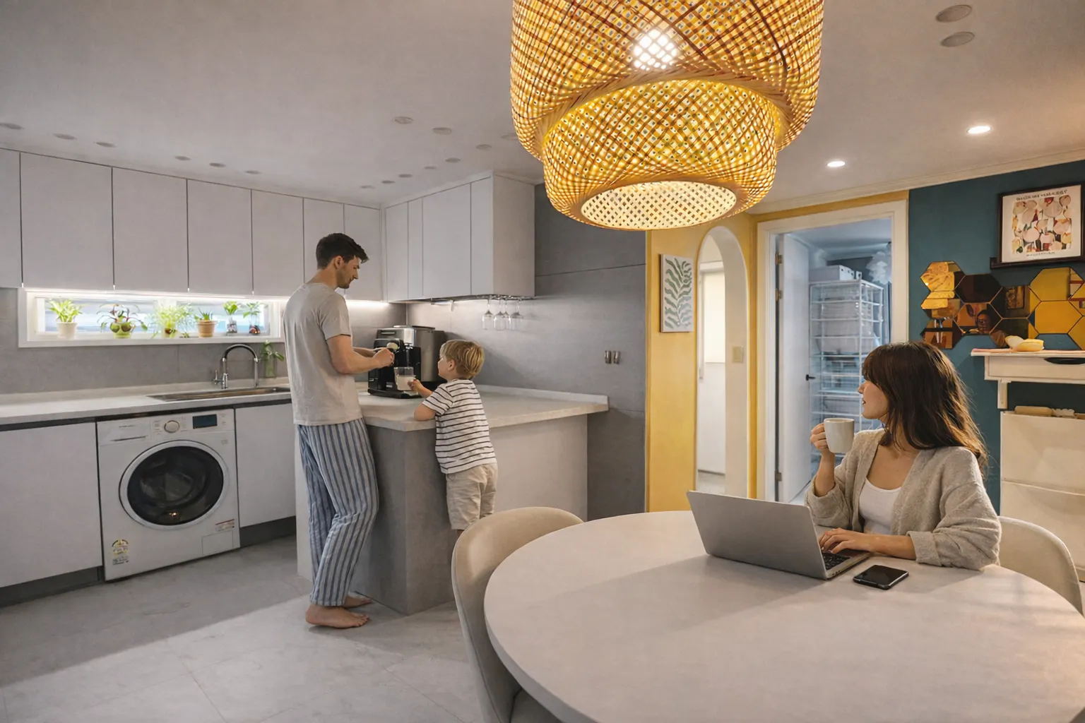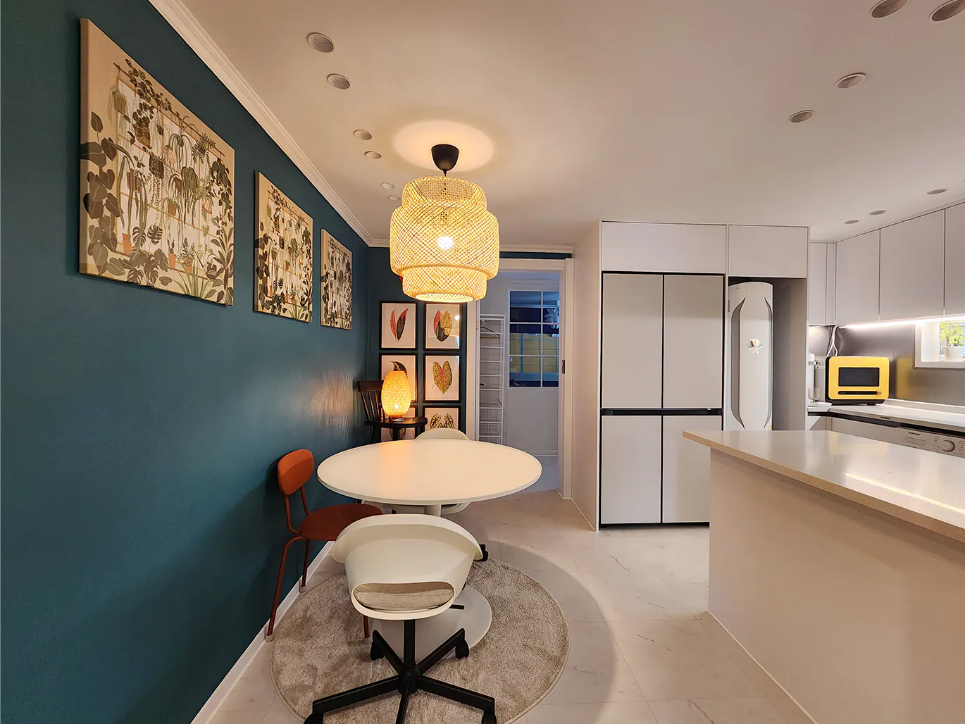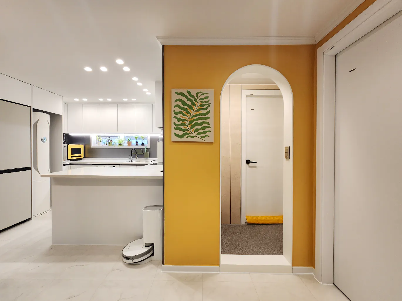 Don’t miss Cheongdam House in Gangnam, Seoul—an ideal retreat for a family of three, featuring a spacious island kitchen, dining area, and a large bespoke 4-door refrigerator.